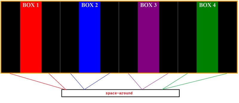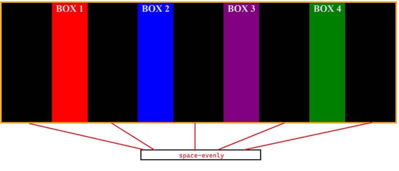 justify-contentproperty works with main axis (horizontal position) and is used to space out columns in a flex container. - When we care about spacing for the layout, we can use one of these values:
