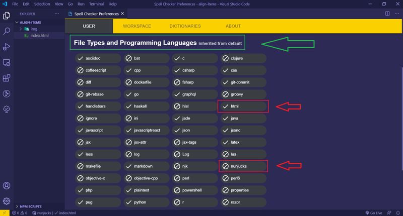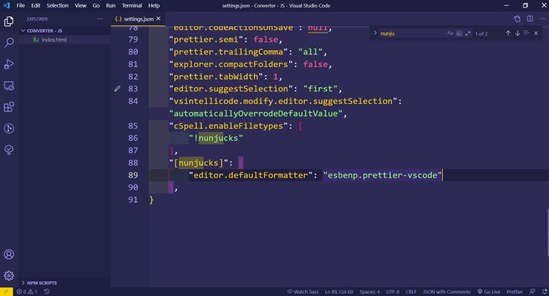 "HTML Nunjucks (nunjucks)" is the configured language.
