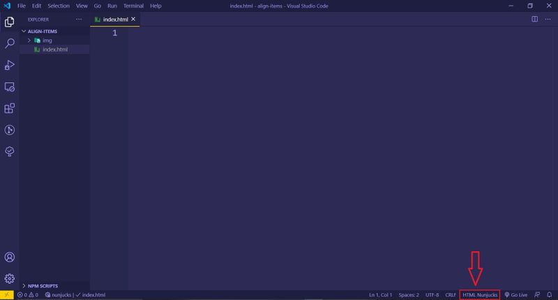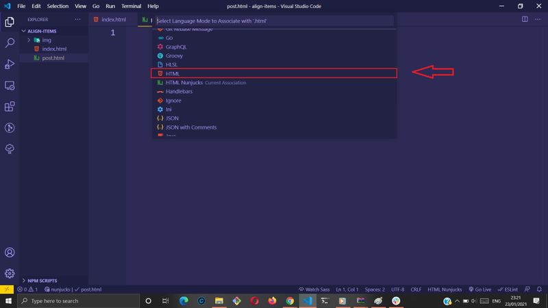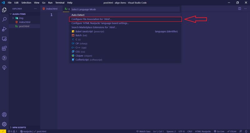 - Click the language indicator that says "HTML Nunjucks" on the right side of the Status Bar.