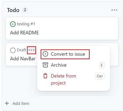 But if you need more time to add a description, hover over the draft issue card. Then click the three dots icon beside the draft text, and click