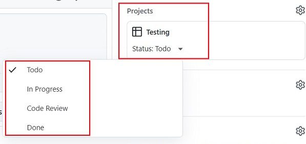 Suppose you want to change the progress status. For example, from Todo to In progress. Click the Status dropdown menu and select In progress. The issue card on the project board will then move to the column you've chosen.