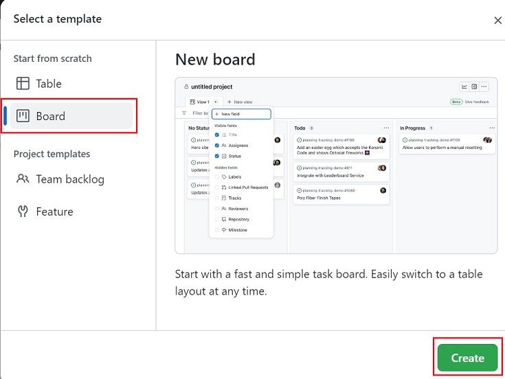 To follow this tutorial, you want to go with Start from scratch. You can choose Table for a spreadsheet view layout or Board for a simple task board. What you choose doesn't matter because you can always switch to any format. But for now, go ahead and select the Board layout, and click the green Create button.