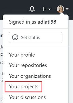✍️ Note: If you can't find the Your projects option, select Your profile or Your repositories after you click on your avatar. Then, on the top bar, click the Projects tab.
