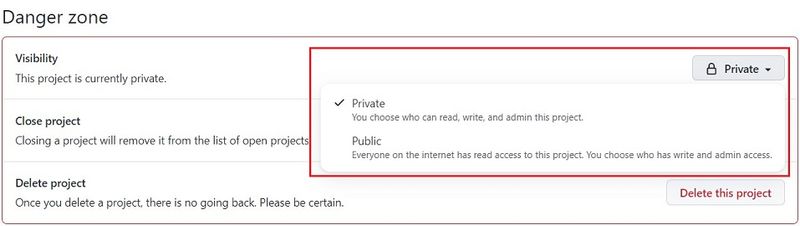Visibilityin theDanger zonesection. Click thePrivatebutton, and selectPublicfrom the dropdown.
