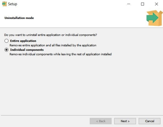 - Select uninstall "individual components" and select only the pgAdmin 4 to uninstall the older version.
