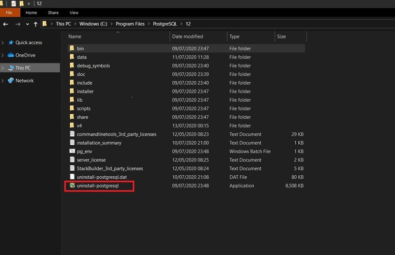 We can find the uninstall application by going to the directory where PostgreSQL 12 is installed on our machine.