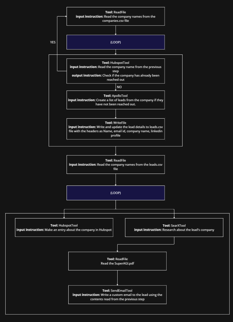 One such example of Agent workflow can be Sales Engagement Workflow. This agent workflow allows AI agents to act as an SDR/BDR for mining prospects’ data and then drafting a personalized cold reach-out message to engage with them. Following the below steps: