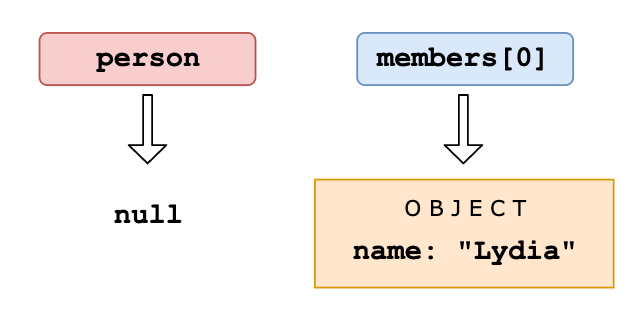 We are only modifying the value of the `person` variable, and not the first element in the array, since that element has a different (copied) reference to the object. The first element in `members` still holds its reference to the original object. When we log the `members` array, the first element still holds the value of the object, which gets logged.