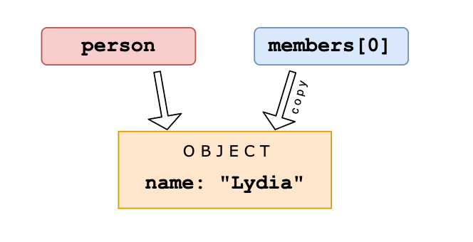 Then, we declare a variable called `members`. We set the first element of that array equal to the value of the `person` variable. Objects interact by _reference_ when setting them equal to each other. When you assign a reference from one variable to another, you make a _copy_ of that reference. (note that they don't have the _same_ reference!)