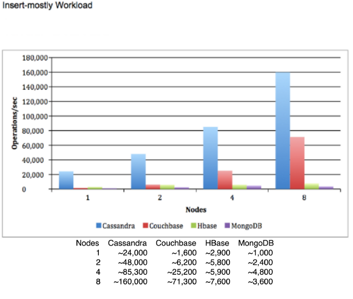 Even though this diagram might be biased and it looks like it compares Cassandra to databases set to provide strong consistency (otherwise I can’t see why MongoDB would drop performance when upgraded from 4 to 8 nodes), this should still show what a properly set up Cassandra cluster is capable of.