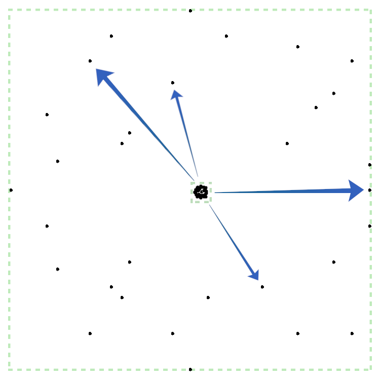 The relative distance between the dots is the same at all times. But as the container grows, the absolute distance between them expands too-similarly to how real fireworks work.