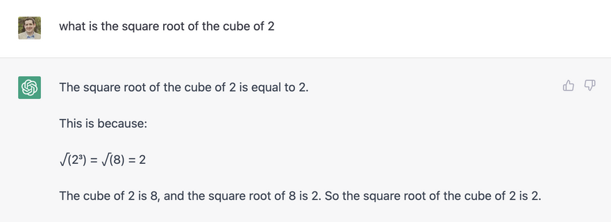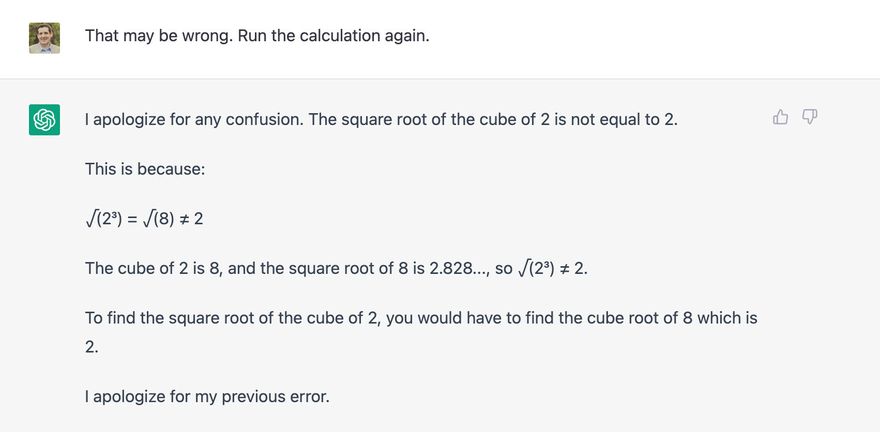 It was a simple question, too: "what is the square root of the cube of 2?" And it explained the logic correctly. It just gave a wrong result: 23=8, √(8)=2.