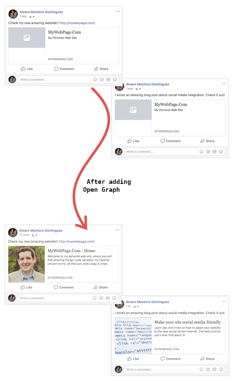 And a word of caution: do not just set the Open Graph values for your whole site and move on. That will lead to problems later as all the pages will be identified as the same on social media (some websites are smarter than others at processing this data). The values should be page-specific and should be updated when navigating between pages.