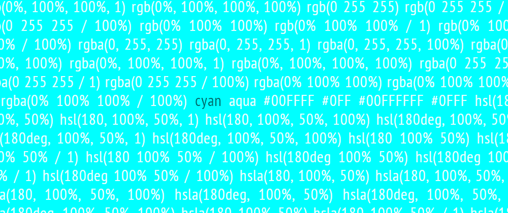 rgb(0, 255, 255)rgb(0, 255, 255, 1)rgb(0, 255, 255, 100%)rgb(0%, 100%, 100%)rgb(0%, 100%, 100%, 1)rgb(0%, 100%, 100%, 100%)rgb(0 255 255)rgb(0 255 255 / 1)rgb(0 255 255 / 100%)rgb(0% 100% 100%)rgb(0% 100% 100% / 1)rgb(0% 100% 100% / 100%)rgba(0, 255, 255)rgba(0, 255, 255, 1)rgba(0, 255, 255, 100%)-