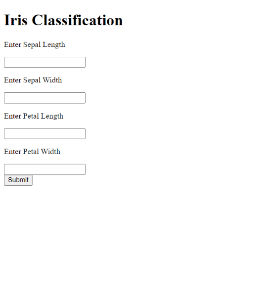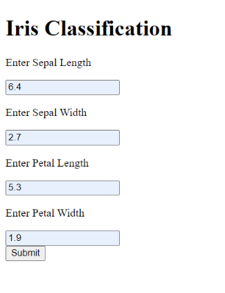 The web app contains four input fields to accept user data. Once the user clicks submit, it will call the API and return the predicted classification in JSON format.