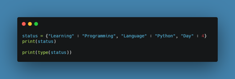 {'Learning': 'Programming', 'Language': 'Python', 'Day': 4}