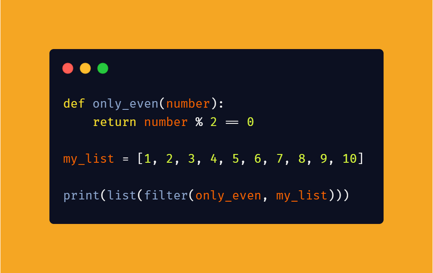 - Consider the following example where the filter() function filters only the items which satisfy the condition of the given