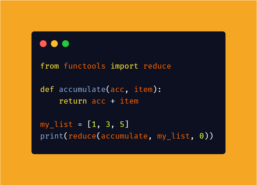 accanditemand returns the sum. - Here, the reduce() function passes the last argument 0 as acc at first and the first item from the list, then it accumulates and passes the sum as acc for the next list item and so on until all the list items are accumulated and the result is displayed.