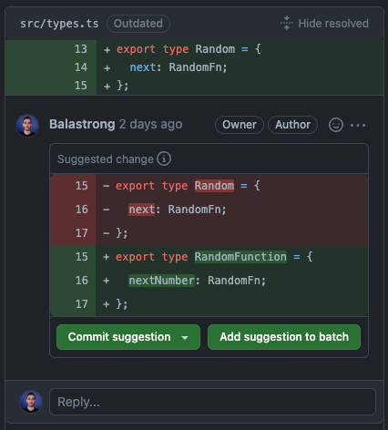 With a special syntax, you can suggest code changes when commenting a Pull Request.