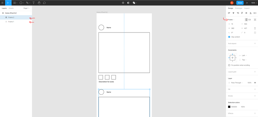 From the right-sidebar you can convert a Group to a Frame. So that's what I did! And then I duplicated (ctrl+D) so I could have it one more time (Image 2)
