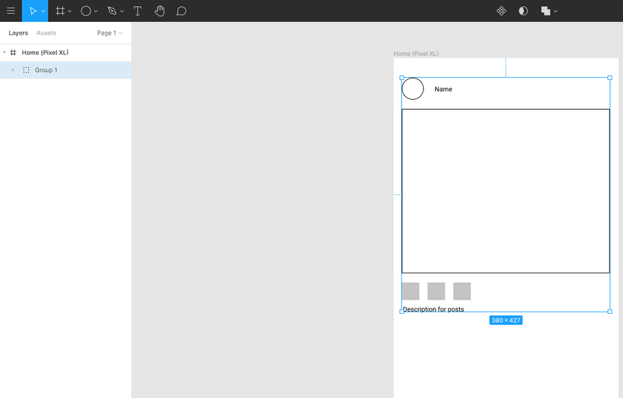 I created a group so I could manage these shapes easier. Groups allow moving a collection of layers around without having to select each individual layer. Groups are used to organize the layers and they are very different from Frames. Frames can have their own dimensions and properties (Image 1).