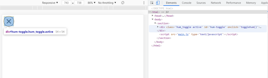 In index.html ,I have created two spans tags within an outer div which class name is hum_toggle. The onclick event is used to trigger a function when an element is clicked on. When you click the .hum_toggle div element, togglehum() function will be triggered. The togglehum() function has declared in main.js.