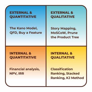 External orientation means that you need to involve stakeholders outside the development team to set priorities, while the internally-oriented methods can be executed purely in-house. Quantitative methods entail a deeper focus on numeric metrics in prioritization, and the qualitative one rests on expert opinions, votings, classifications to a greater extent. In view of this, they are traditionally divided into the following categories: