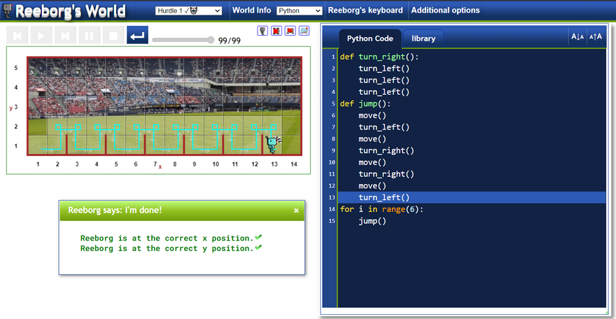 Let's start with Hurdle 1 (you can select it in the first dropdown menu) and make sure to select python in the second dropdown. You can also check world info which gives the information about what are the functions to be used and how to write the code and also shows the output format. You can also see the Reeborgs keyboard beside python which gives information about the pre-built functions of Reeborg.