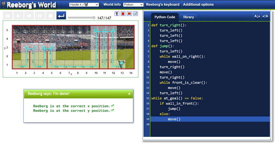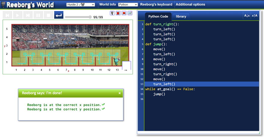 Since we don't know the exact position of the flag, in spite of 6 we use at_goal() function here. That's it we have completed Hurdle 2 also.