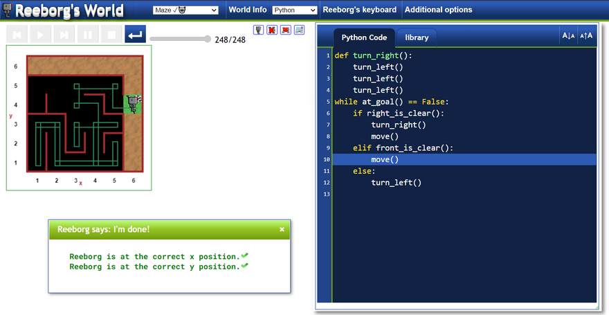 Our robot should stop its execution at the flag with correct coordinates. If you examine the Reeborgs keyboard correctly you can see that there is no turn_right function. To successfully complete this riddle we need turn_right so let's first define it.