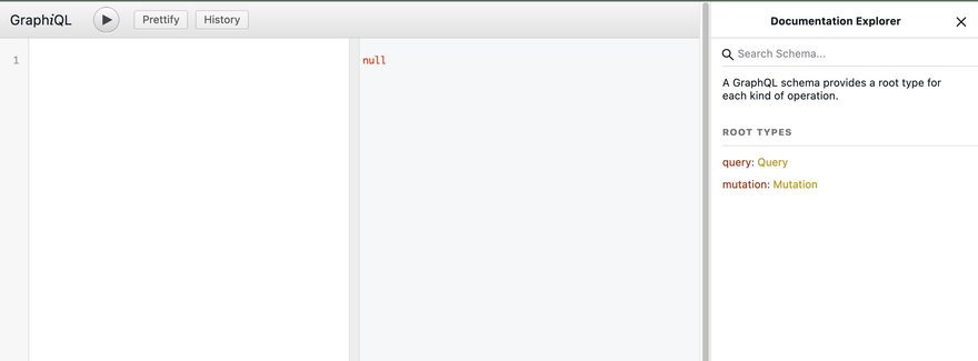 The usual response should appear and we can open up our browser and head to http://localhost:5000/graphql. Here we should see an empty GraphQL query page where we can test our queries and mutations, also just play around with it and learn!