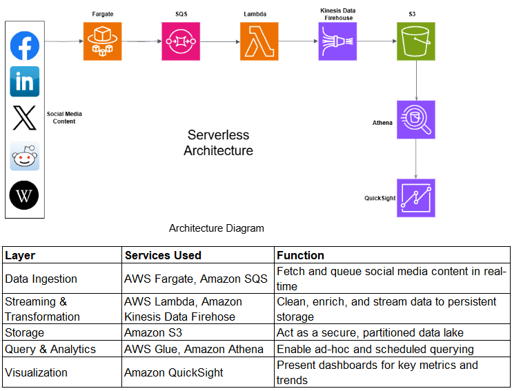 This post details how to build a scalable, cost-efficient, and serverless data pipeline on AWS to ingest, process, and visualize social media data. This architecture is designed to turn chaotic social chatter into clear, actionable insights.