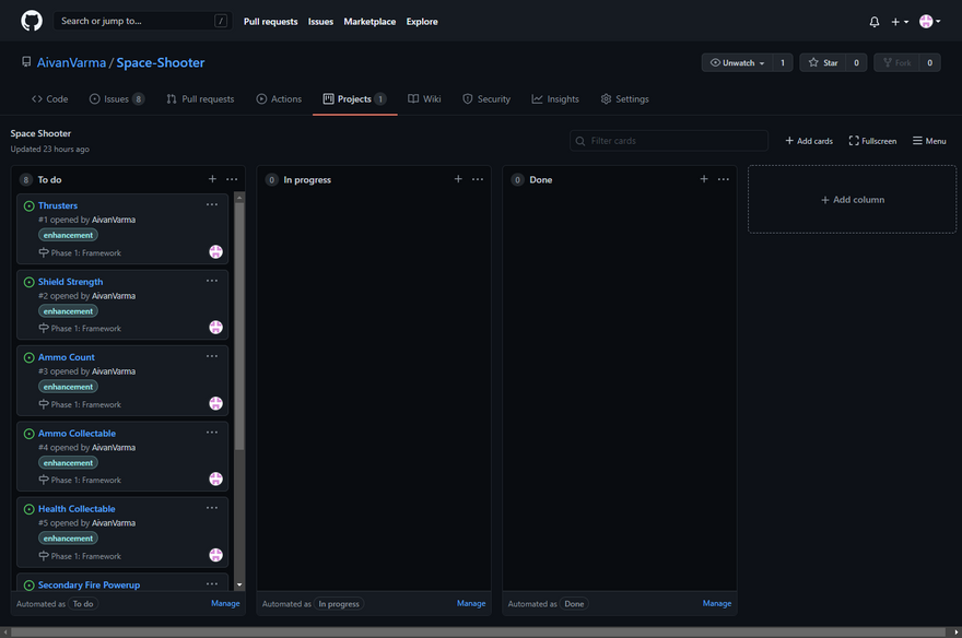 Since I haven't done planning that much I gave myself a generous 15 days to complete 8 issues. Thus far everything has gone well. I'd say I use one third of the time in Unity's docs, half of the time coding and the rest testing out what ever feature I'm implementing.