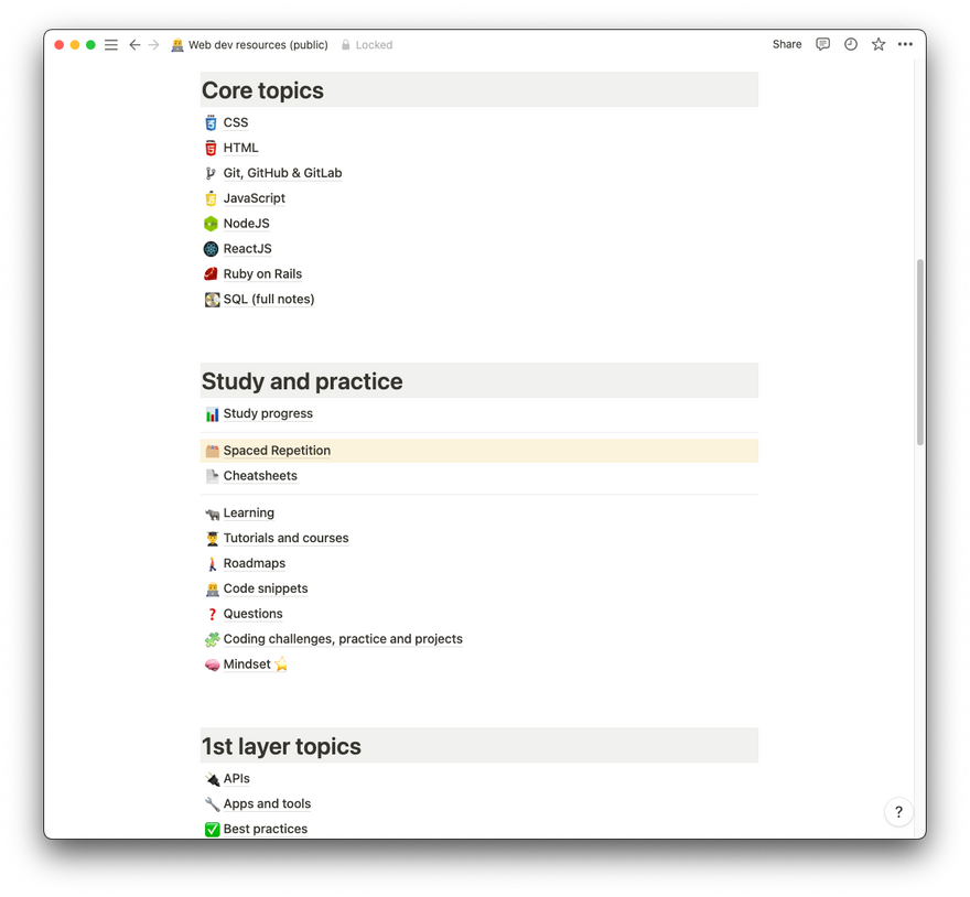 Please, feel free to create a copy of this template and adapt it to your own needs. I found it very useful in my journey of becoming a Web Developer, and I still use it almost every day. It has become an extension of my brain, and I rely on it every time I have a question or doubt.
