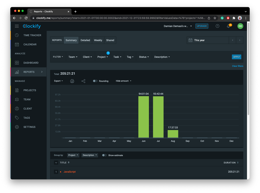 For example, as shown in the picture above, during the months of June, July and August, I spent 205 hours studying JavaScript.