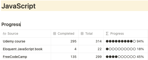 My preferred tool for measuring this is, again, Notion. You can take a look at the template I use by downloading it from here, and going to the Study progress section.
