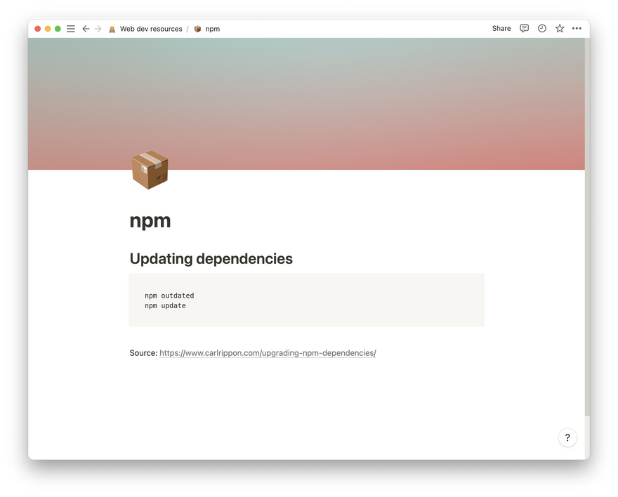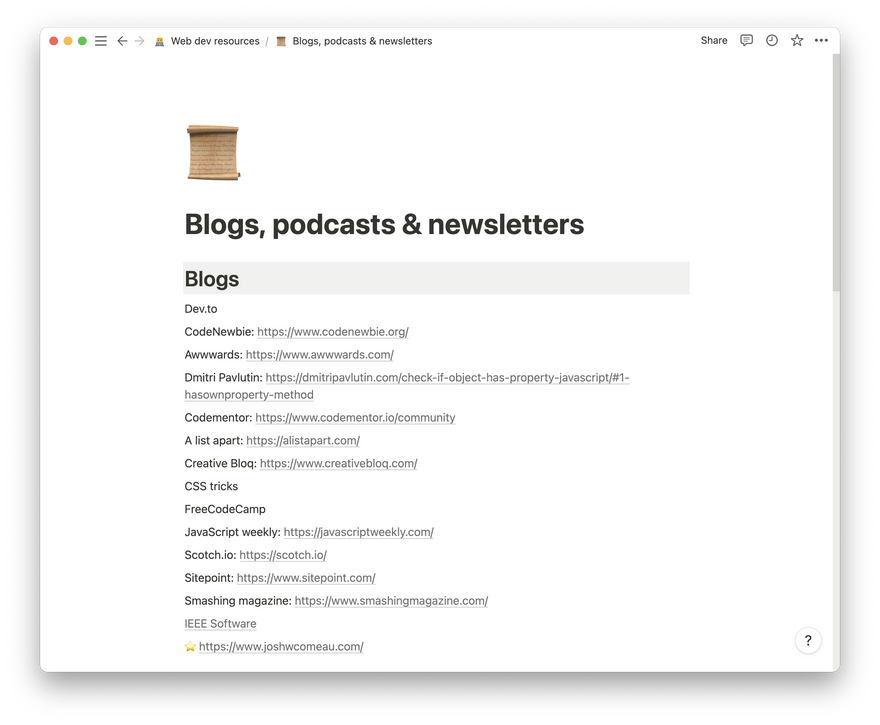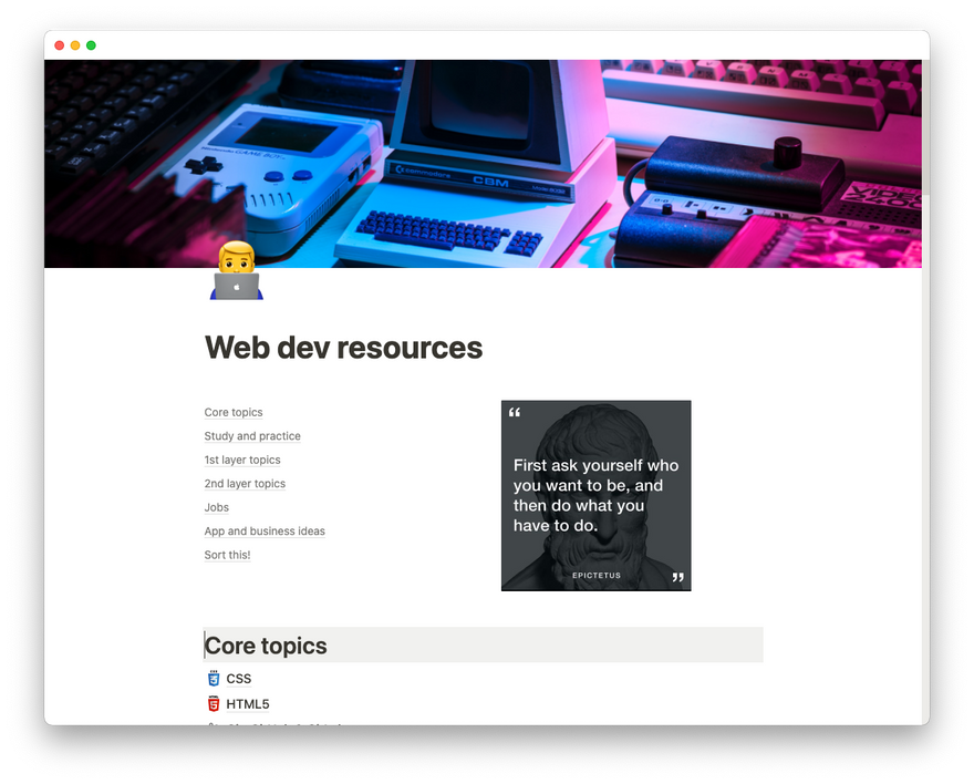 The main idea of a commonplace book is to store notes that are important and related to a common theme: web development. You can use Notion as the main tool to build a commonplace book or choose another preferred tool, such as MS Word documents, OneNote, Google Docs, Evernote, etc. I wanted to show you how I organise my notes and maybe give you some motivation to start doing so.