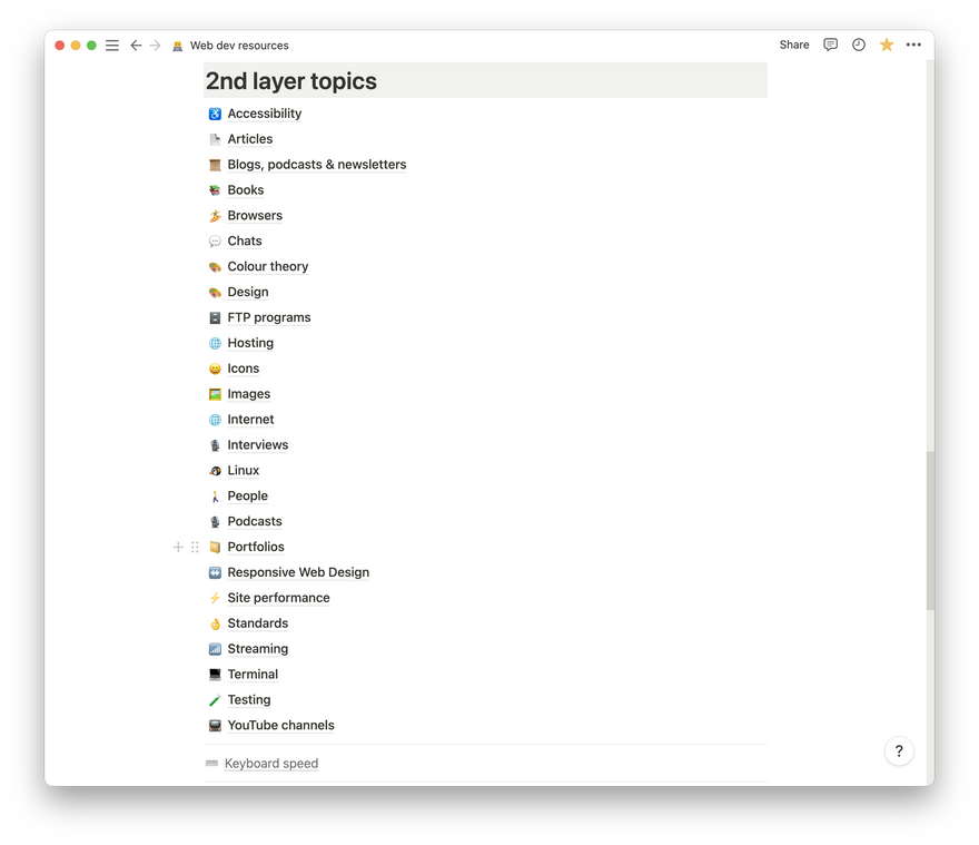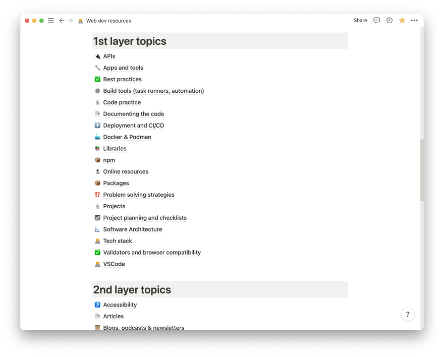 Continuing with the onion metaphor, the 2nd layer after the 1st one will contain topics related to the world of web development but that are not directly related to its core, such as colour theory, interesting interviews, portfolios that I like, standards, etc. This classification is totally subjective, and what I consider a 2nd layer could be a 1st layer or core concept to you. That's the beauty of this method of organising notes: you can make it your own!