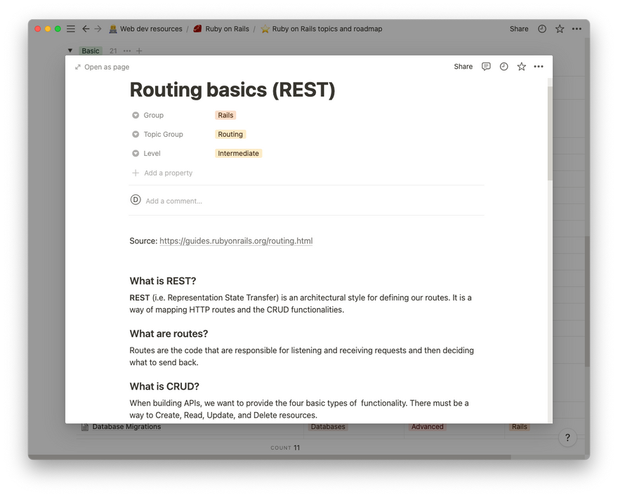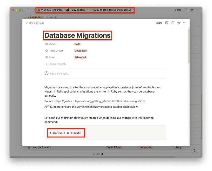 For example, if I'm working on Rails and I want to do a database migration but I don't remember how, I just go to Notion and open the Web dev resources > Ruby on Rails > Ruby on Rails topics and roadmap section, and I press ctrl + F to search for "migrations". The note will be highlighted, and when I opened it I would be able to see what I am looking for: