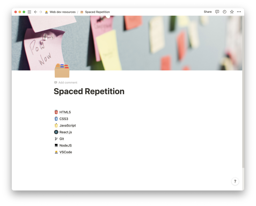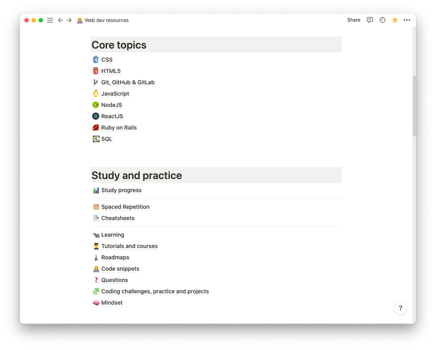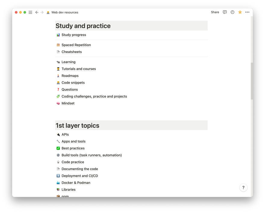 When I started studying web development I decided to use Notion as a note-taking system. At first, I didn't follow a set structure, but as new concepts came in, I decided to divide my notes into the following parts: