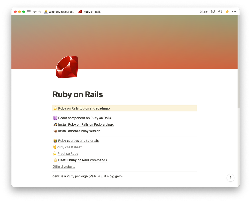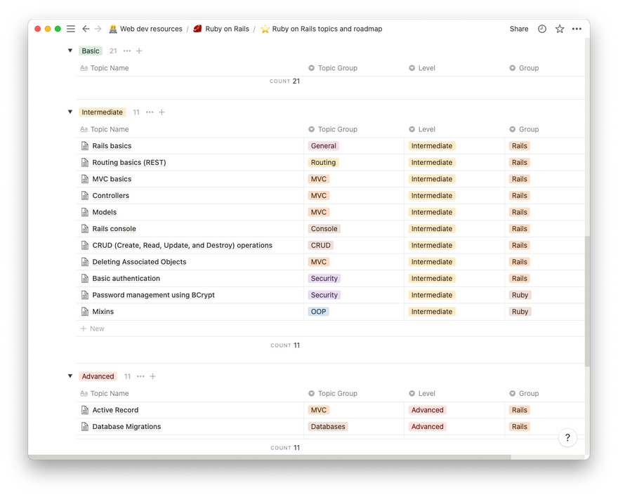 I usually have a "topics and roadmap" sub-section with a description of specific topics related to the programming language. For example, in the Ruby on Rails sub-section, I have a Notion database with the name of the topic, its group, and the level of difficulty.