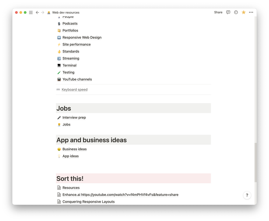 I tried many other ways of organising my notes, often involving complex Notion databases and relations between notes, or complex multicolumn designs on each Notion Page, but I found that complexity often gets in the way of the ultimate objective: a simple way to insert and extract information. Complex layouts also don't work too well on mobiles.