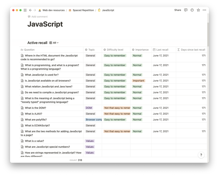 The idea is to visit this section regularly (something that I struggle to do, unfortunately) and to answer the questions going from the ones that have more days since the last recall and the most difficult ones to the easiest.
