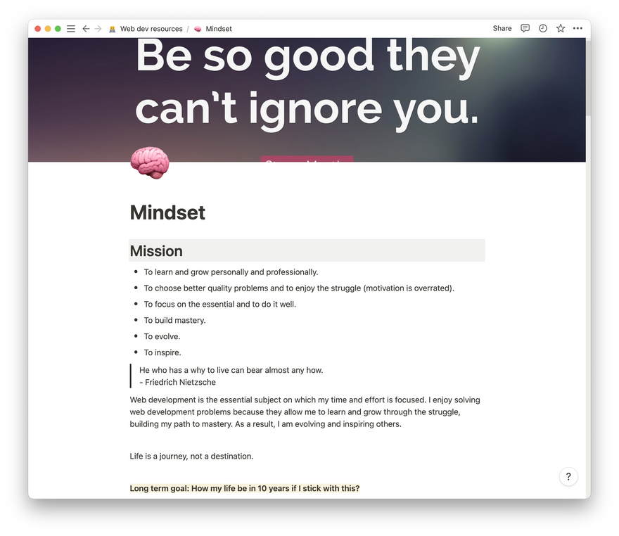 Sometimes we can feel overwhelmed about our journey through the web development world. We can even feel lost, without aim, not remembering why are we putting so much effort into what we are doing. This is when the "Mindset" subsection comes to help. Here I have my mission statement: an answer to the "Why am I doing all of this?" question.