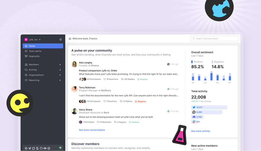 We unify community engagement, product usage, and customer data into a single place, and use intelligence to surface actionable insights. With Common Room, DevRel teams quickly understand whatโs happening in their communities โ across GitHub, StackOverflow, Meetup, Slack, Discord, Reddit, Twitter, Dev.to and more โ so they can monitor community health, find product champions, source and amplify content, and build internal advocacy all with the goal of shaping and shipping better products and experiences for their communities (many of which youโre likely a part of now or will be in the future!).