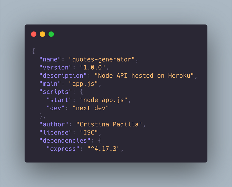 If we open package.json, we will see the packages we have installed under βdependenciesβ. In this case, we will see express. At this point, we should add an extra line in the package.json with: "scripts": "start": "node app.js". The final overview should look like this: