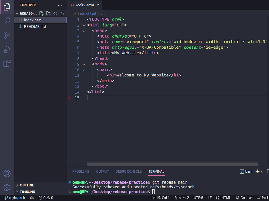 What is happening here? I don't have the latest changes from main because mybranch is behind main. How can I fix this? The scary command is everything I need. I only need to type git rebase main and I will automatically move mybranch on top of main getting the latest updates and voilΓ‘: I can see now the index.html file on mybranch.