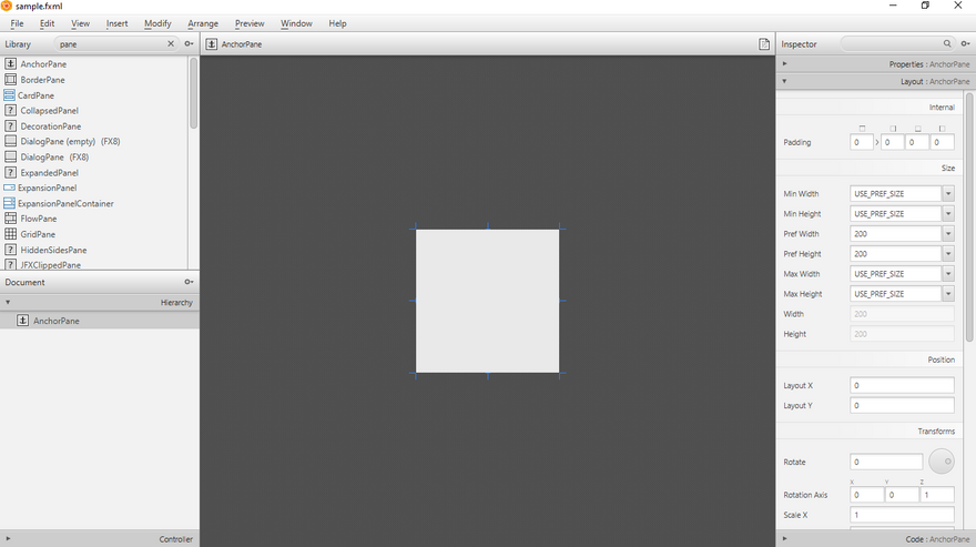 Next you will see on your right a new panel called "Inspector". In this panel you can edit all the properties of your elements. In this case we will edit the width and height of our Anchor Pane (since this is our root element, these numbers will define the dimension of our window). You can put the numbers you like, I'll put 200 x 200.