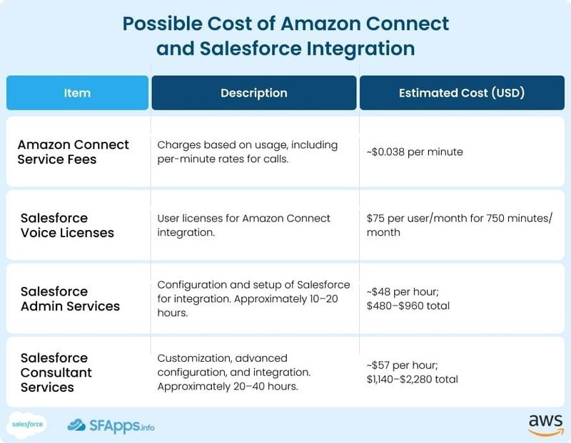 Integrating Amazon Connect with Salesforce involves several cost components, including service fees and professional services. Below is a breakdown of these costs: