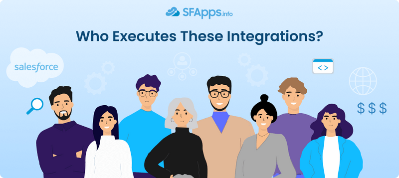 The task of completing any custom Salesforce integrations typically falls on a dedicated team composed of various roles, each bringing a unique set of skills and expertise to the project. The complexity and requirements of the integration will dictate the exact composition of the team, but generally, it includes: